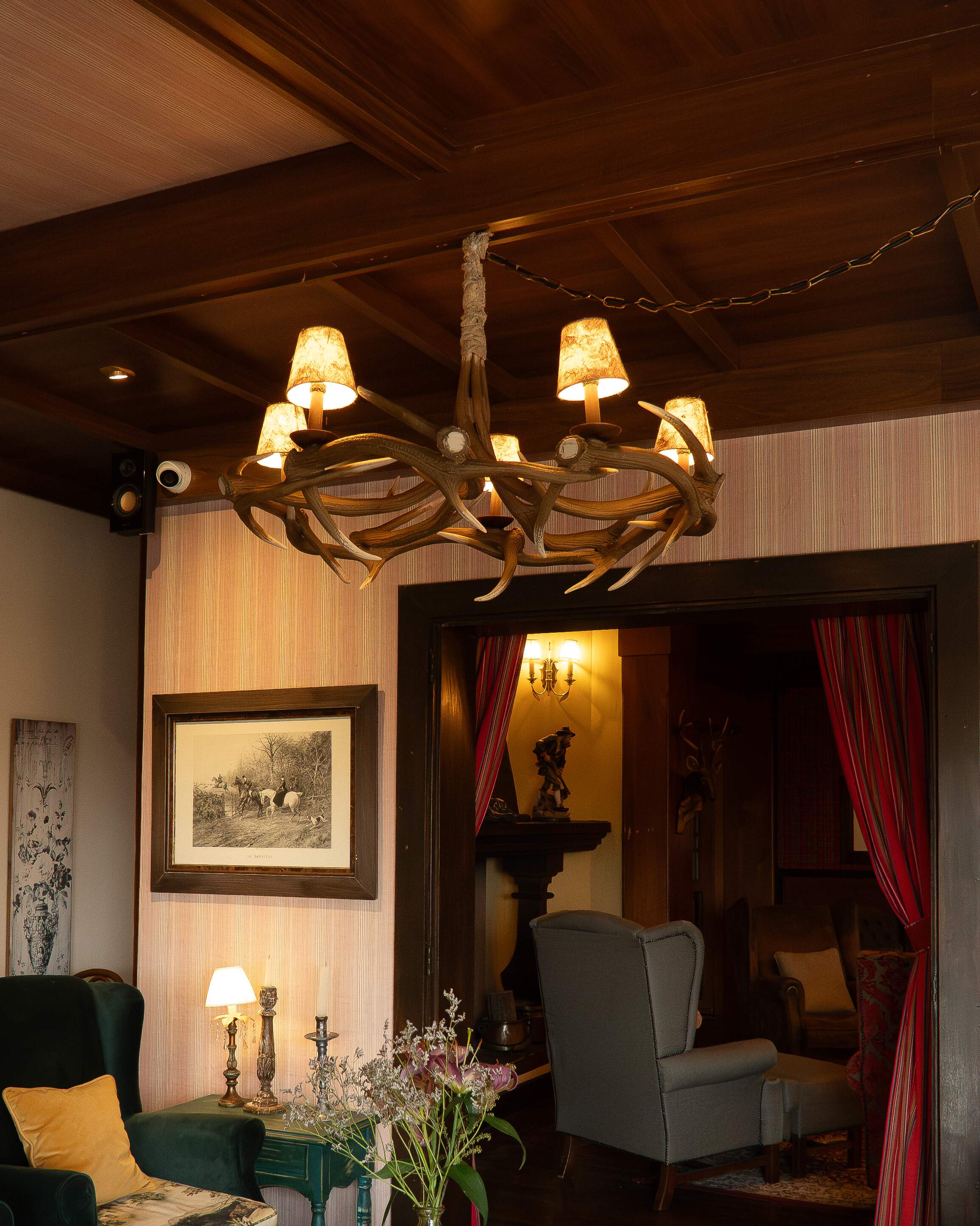 O corredor, um espaço de transição frequente entre a casa e o haras, foi decorado com arandelas de chifres de alce, que oferecem uma iluminação funcional e mantêm o toque natural que tanto reflete o estilo de vida de Ignácio. No quarto, o lustre Mackenzie foi a escolha perfeita para criar um ambiente de descanso, com uma iluminação suave e elegante.